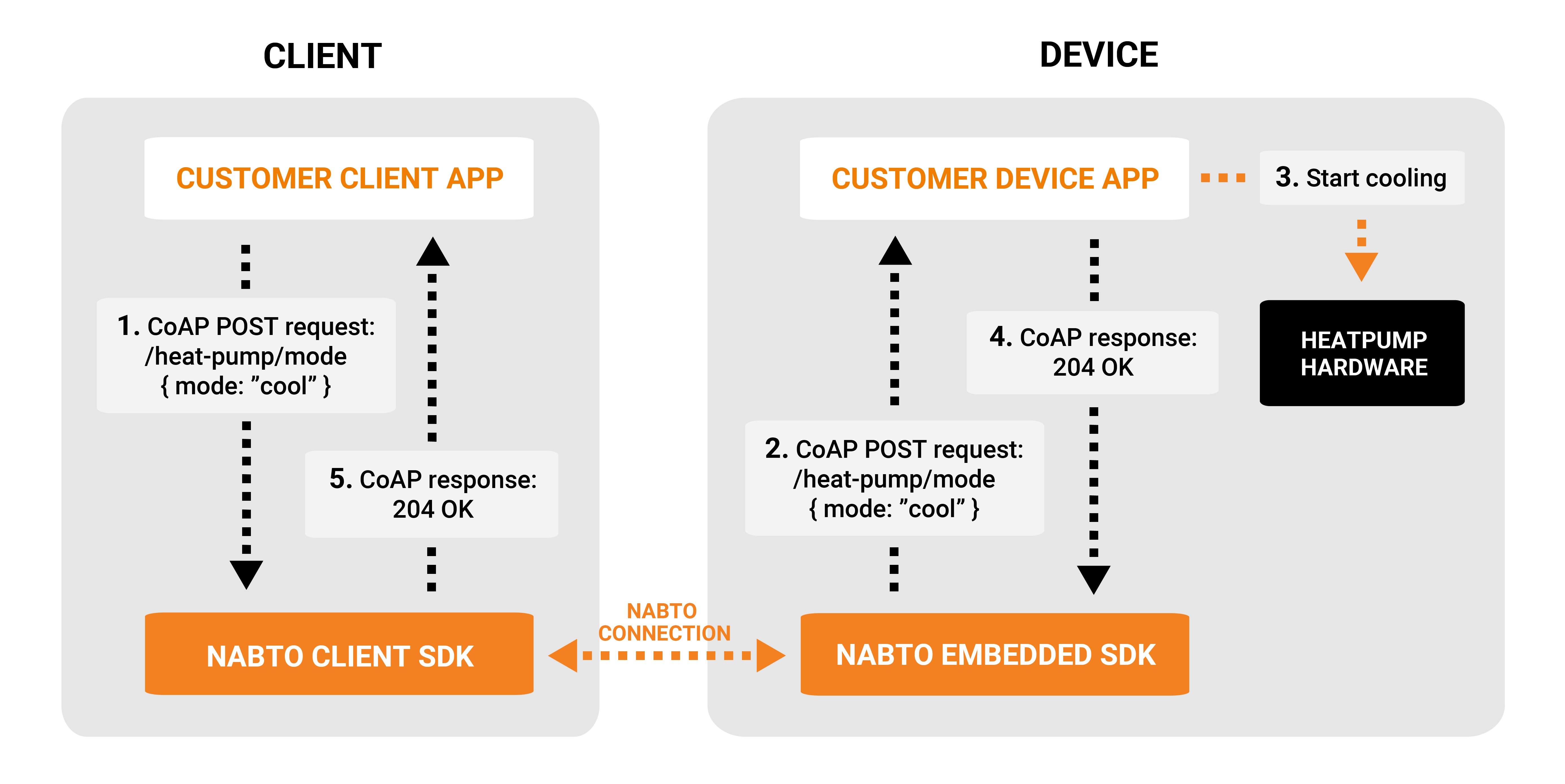 Through the Nabto Edge Client SDK, you first connect to the remote device, transparently mediated through the Nabto Basestation servers. You then invoke a CoAP request on the connection. The request is passed on through the Nabto connection to the target endpoint which handles the request. A response is sent back to the client application. That is all there is to it - only development needed on the client and device side.