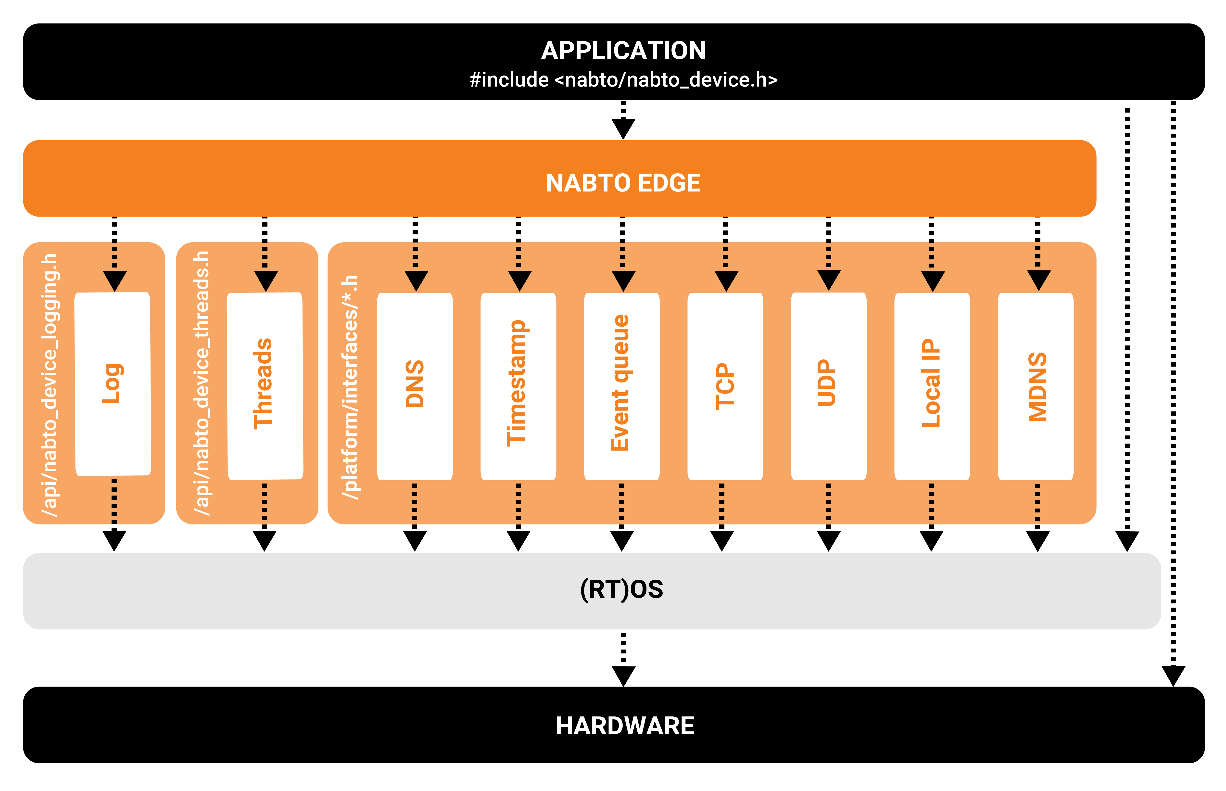 Nabto Edge needs to know about the underlying platform it is running on. The way to “inform” Nabto Edge about this platform is to implement a list of functions and supply Nabto Edge with these functions. The functions are defined in .h files, some implementations are provided as function pointers setup at runtime, some are linked into the target as outlined in the following.