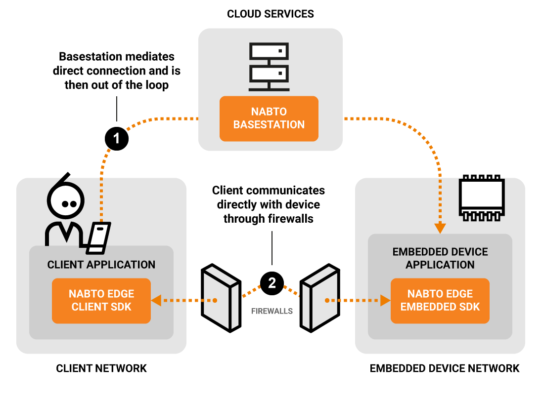 No central cloud application development needs to take place - once you have registered your purchased devices with the Nabto Edge Basestation, it simply mediates connections between your client and device applications without further ado.