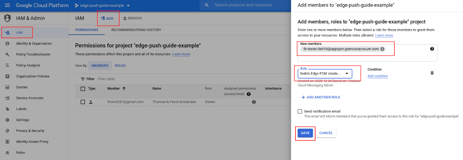 IAM & Adminpage. - Add the Nabto Edge Push service account: