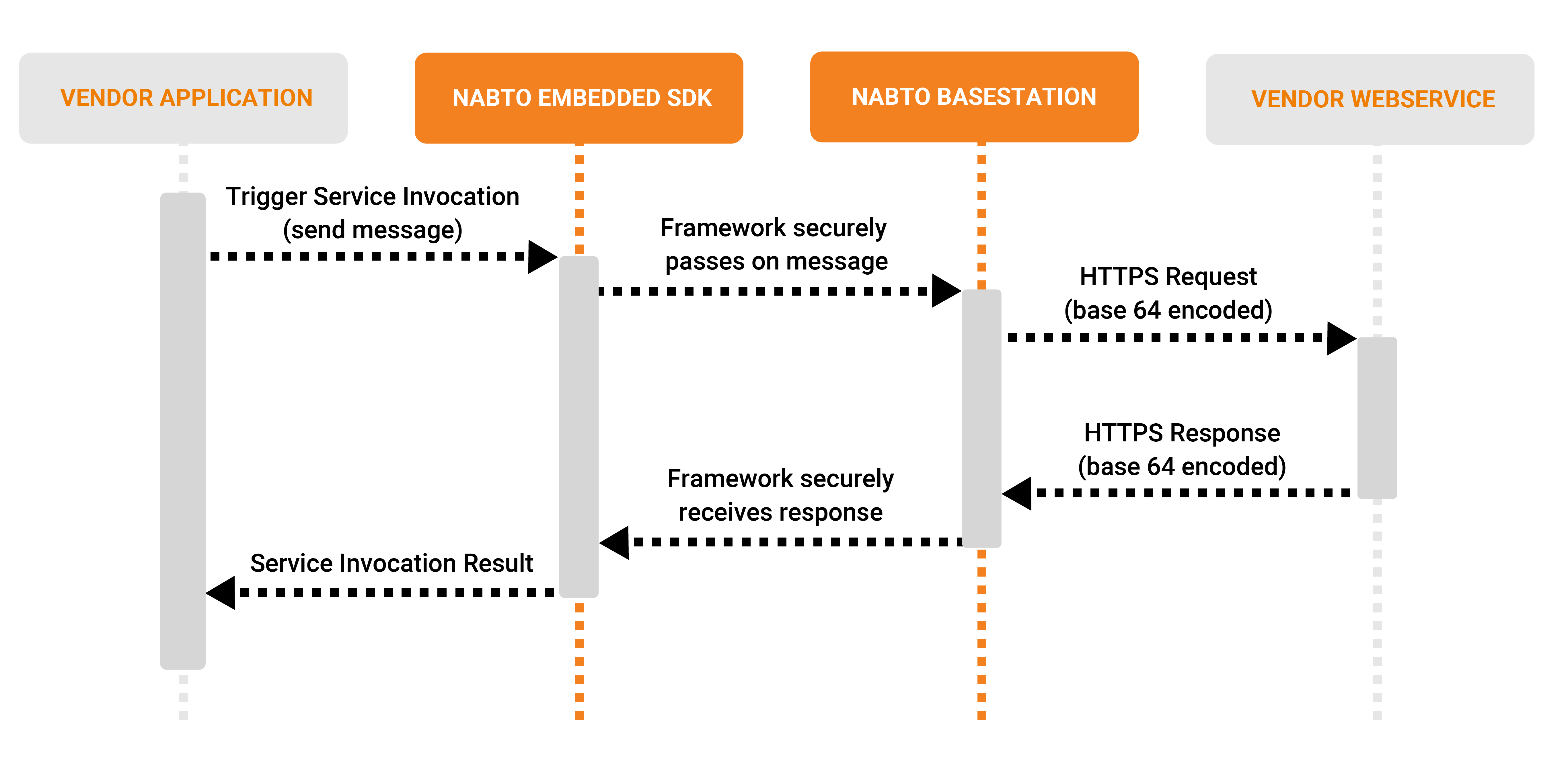 Note that the Nabto Basestation must be trusted in this scenario as the request and response from/to the device exist in cleartext when being passed to/from the configured webservice. The device can apply application level encryption to ensure end-to-end encryption between the device and the external vendor webservice if this is required.