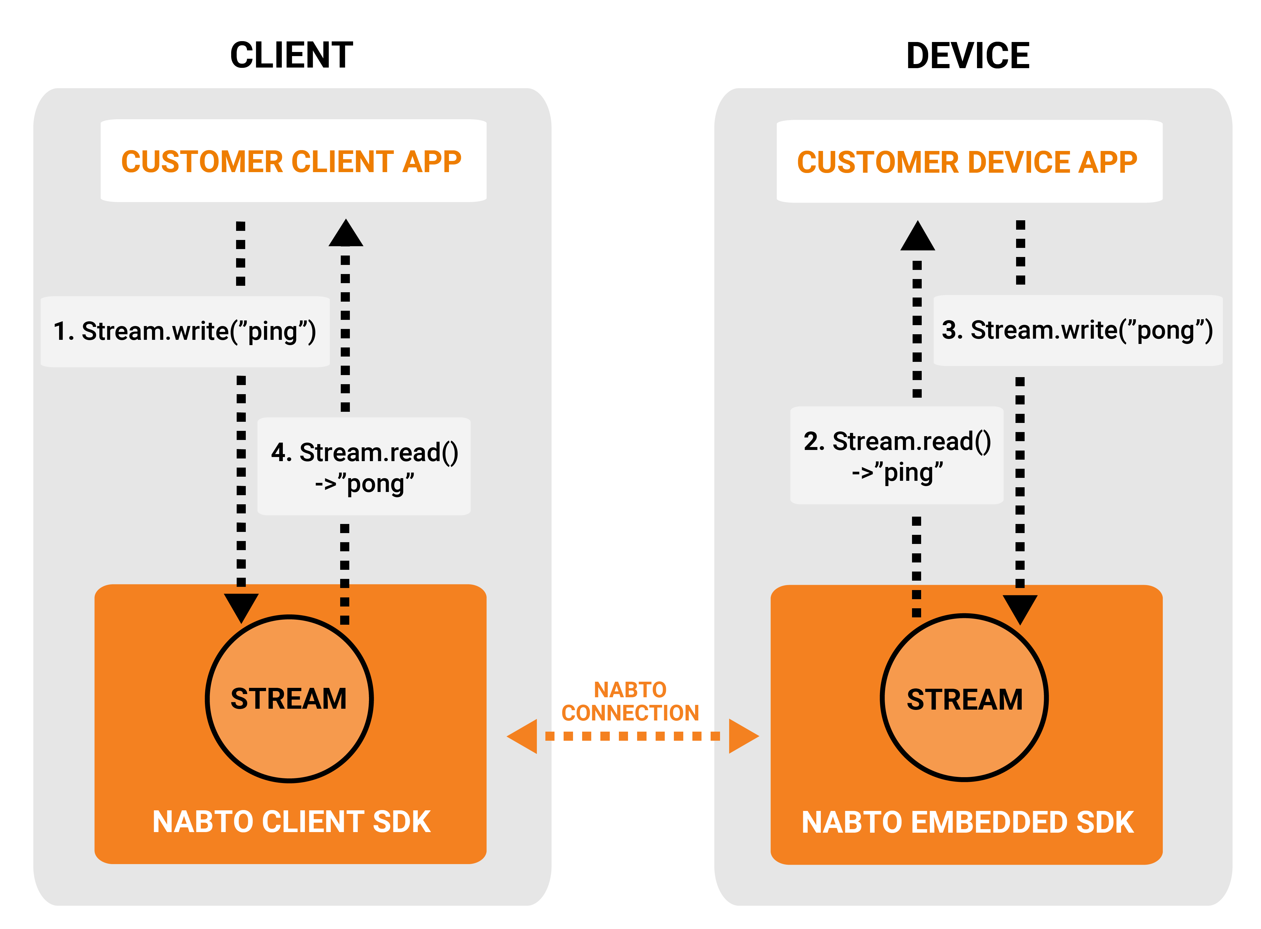 The Nabto Edge platform provides a higher level wrapper for streams for much simpler integration: If you have an existing TCP client and TCP server, you can inject Nabto Edge TCP Tunnels between these two for very quick and simple integration. The tunnels are implemented under the hood using the Nabto Edge Stream API.