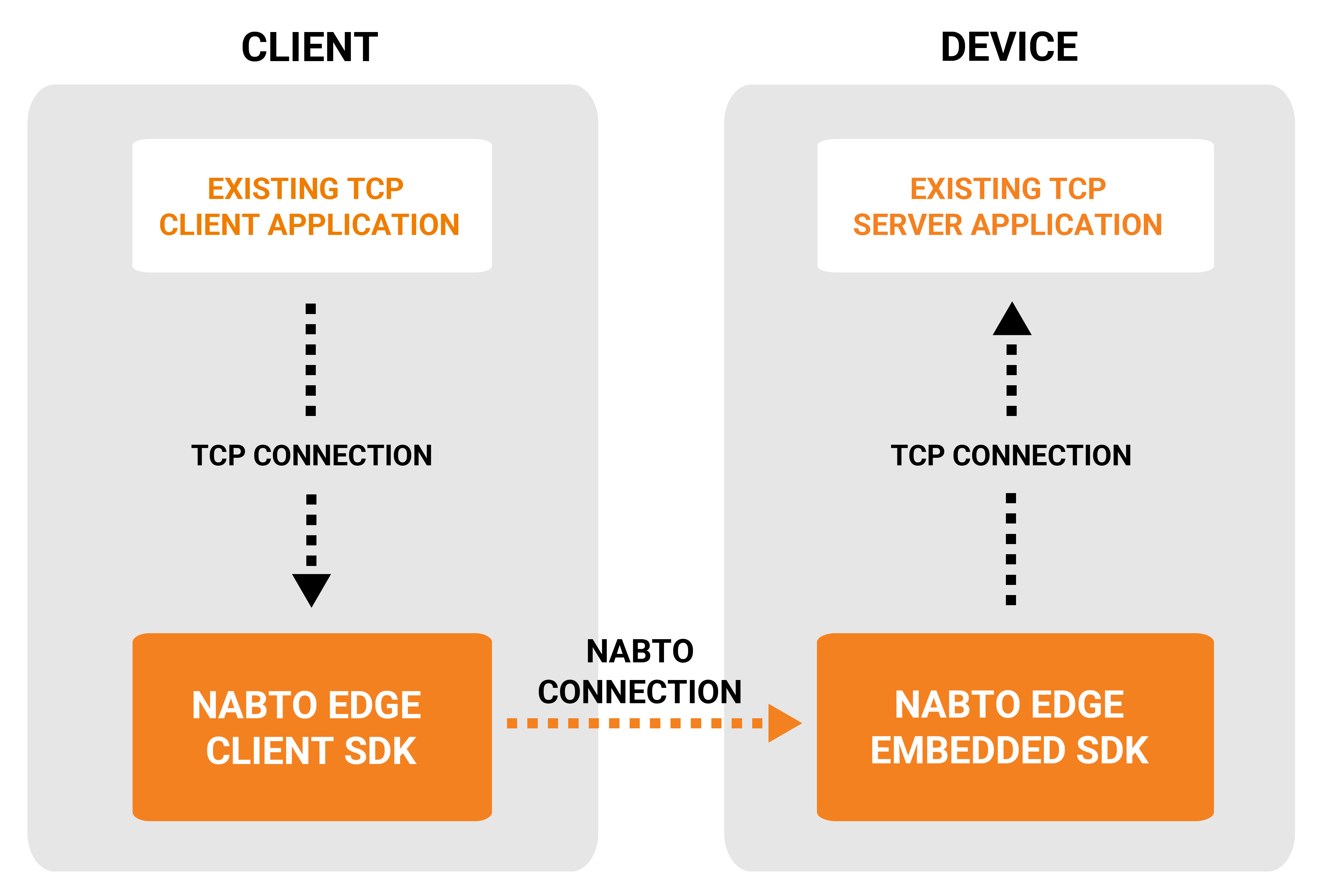 This way of integrating Nabto is particularly useful if you want to add secure remote access capabilities to existing TCP client/server applications: Only minimal code changes as the existing TCP client just needs to connect to the local Nabto proxy TCP server started in the client application instead of the actual TCP server.