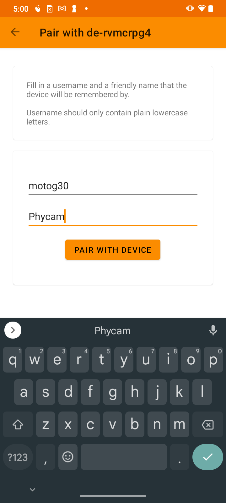 Once you are connected to a device, discovered locally or connected using the entered information, you can complete the pairing: Enter a username as you would like on the target device - the default is likely fine, it is derived from your mobile device name (change it if already taken on the target device). And provide a name for the device for your own bookmarks in the app: