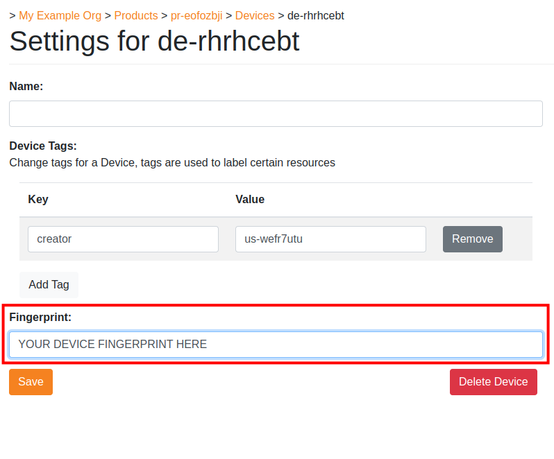 Copy the fingerprint string and paste the fingerprint into the Fingerprint input in the settings page in the Nabto Cloud Console. Without this fingerprint, the cloud console will not allow the device to connect, prohibiting remote connections.