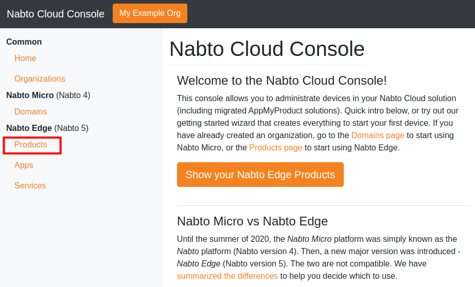 In this step we create and configure a Nabto Edge device. Go to https://console.cloud.nabto.com/ where you can register and log in to the Nabto Cloud Console. Once you have registered and logged on, you will be greeted with the home page. From here click on the Products link in the sidebar.