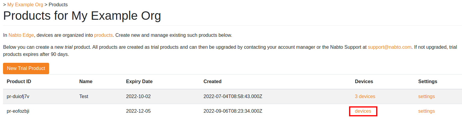 Now press New Trial Product to create a trial product. Creating a product will send you to the settings page for your new product. Return to the products page by clicking Products in the sidebar again. Now you should see that a product has been added to the list. Take note of the Product ID column.