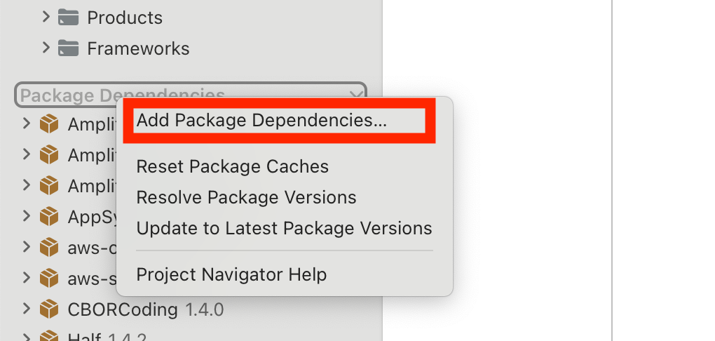 Or add it through XCode by right clicking “Package Dependencies” in the project explorer: