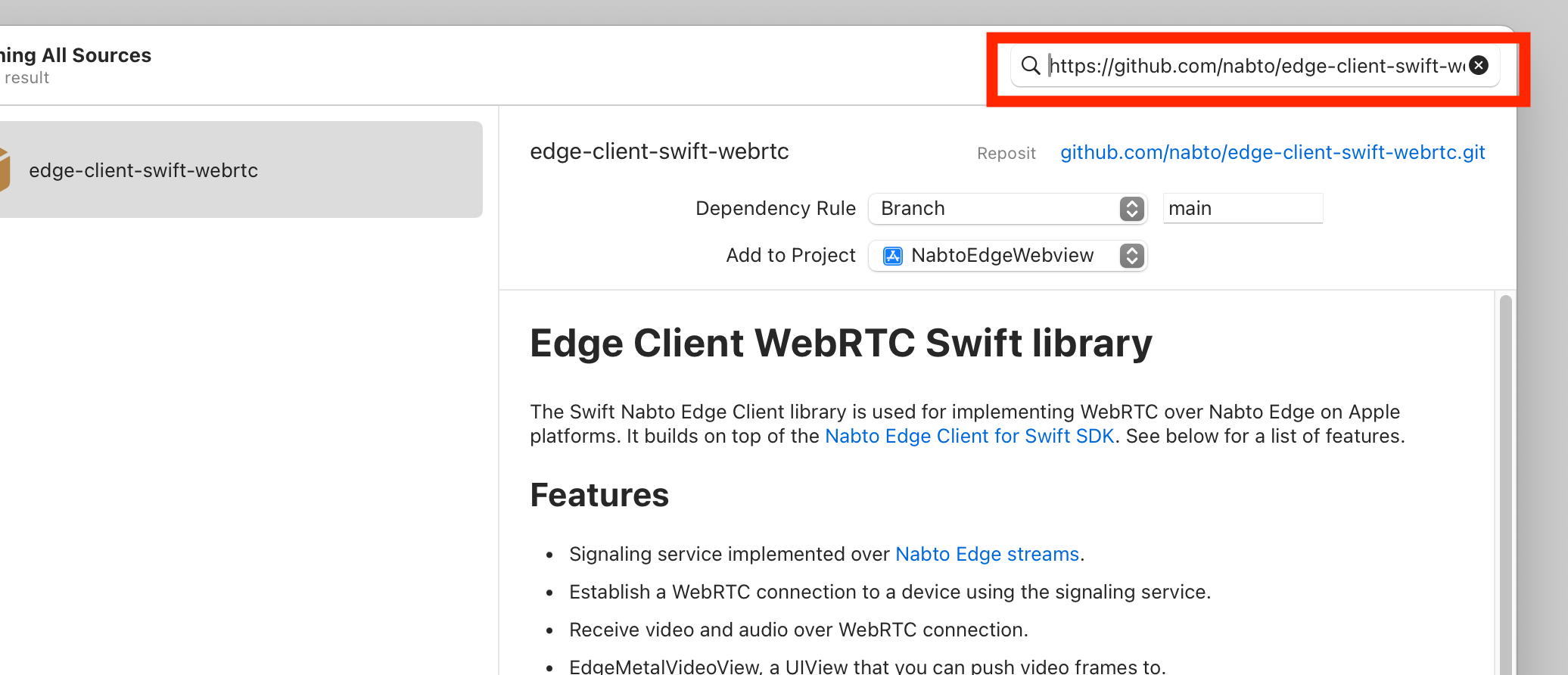 Add the package by entering its URL: https://github.com/nabto/edge-client-swift-webrtc.git: