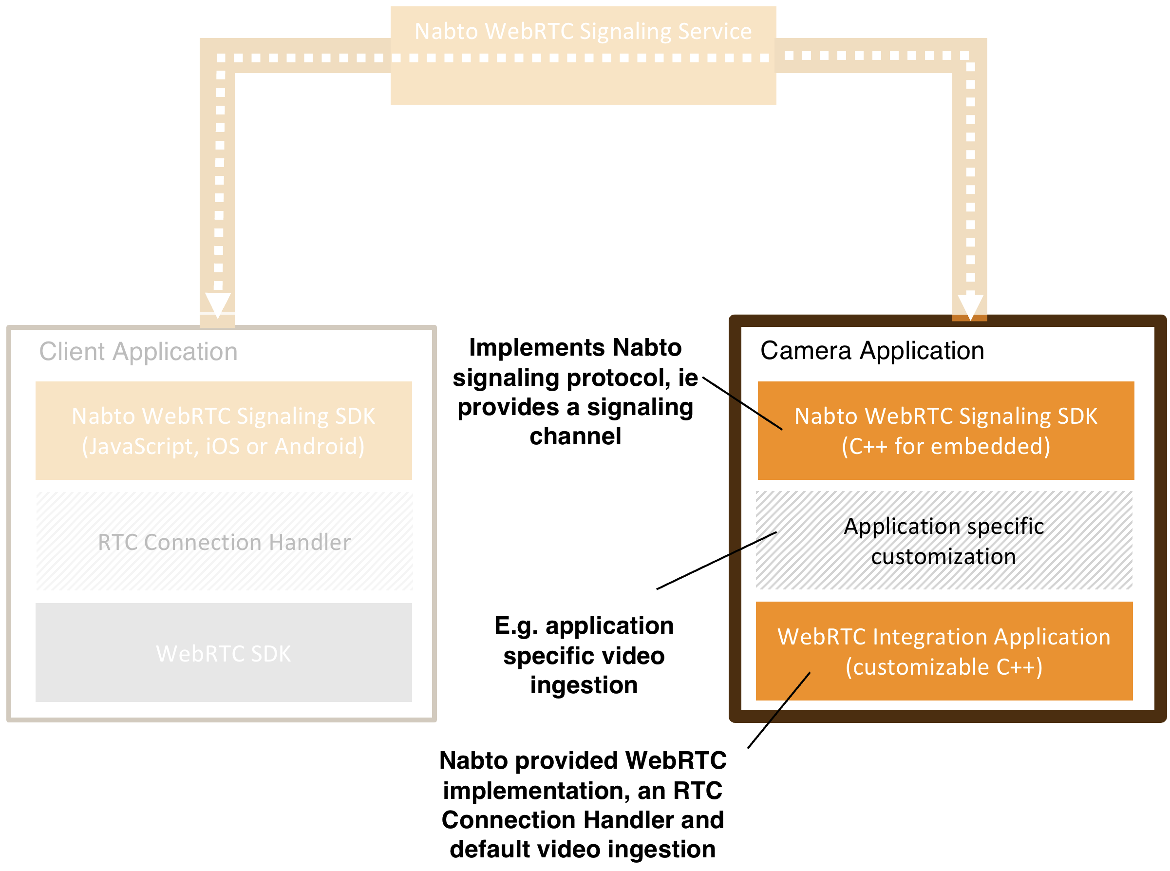 To use Nabto WebRTC, the vendor installs an application on the camera, integrated with the Nabto WebRTC Signaling SDK. The C++ based SDK is designed for this application type. Nabto provides ready-to-use standalone applications as an alternative to integrating the SDK into custom applications.