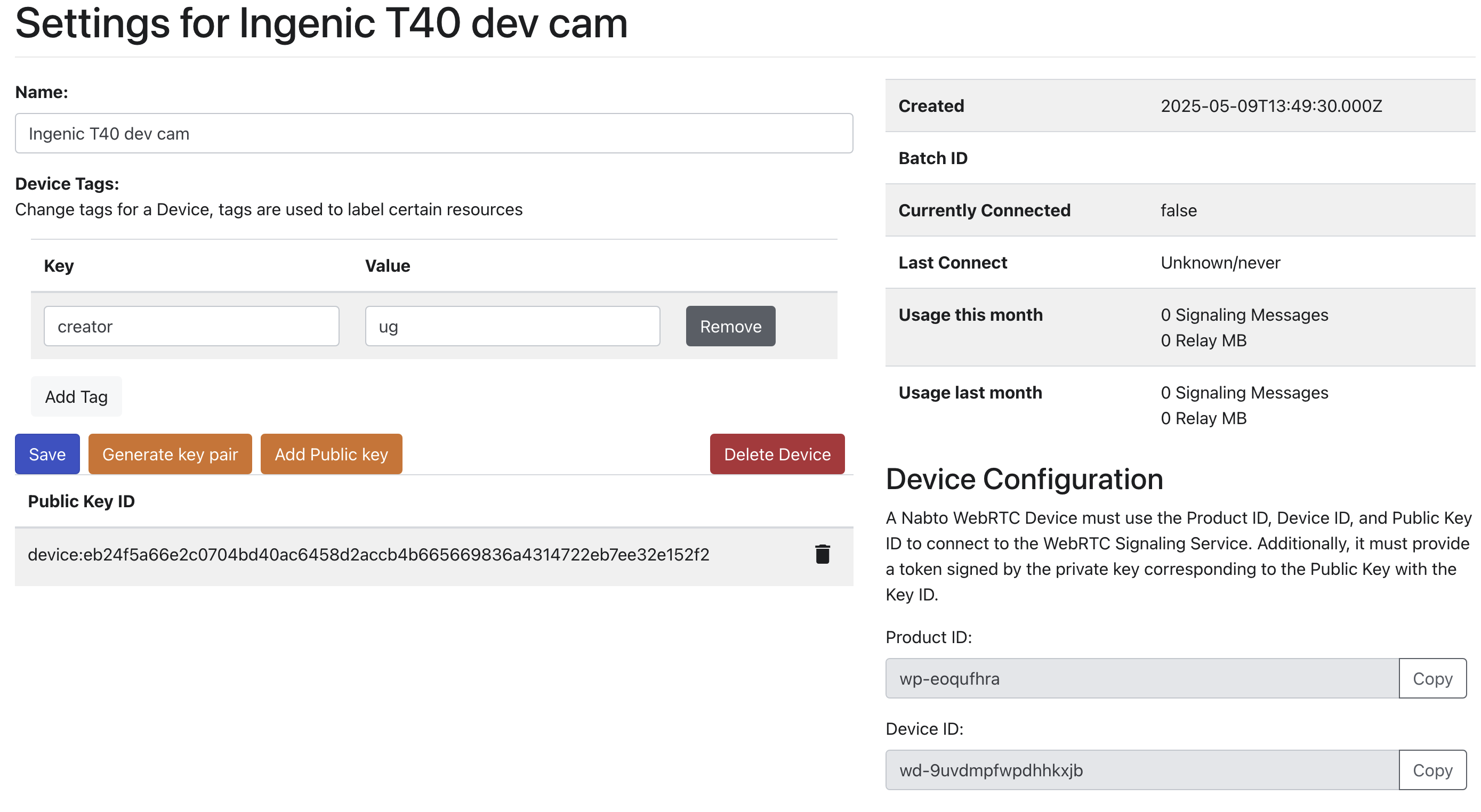 This guide explains how to configure the identifiers and keys required for devices to connect to the Nabto WebRTC Signaling Service.