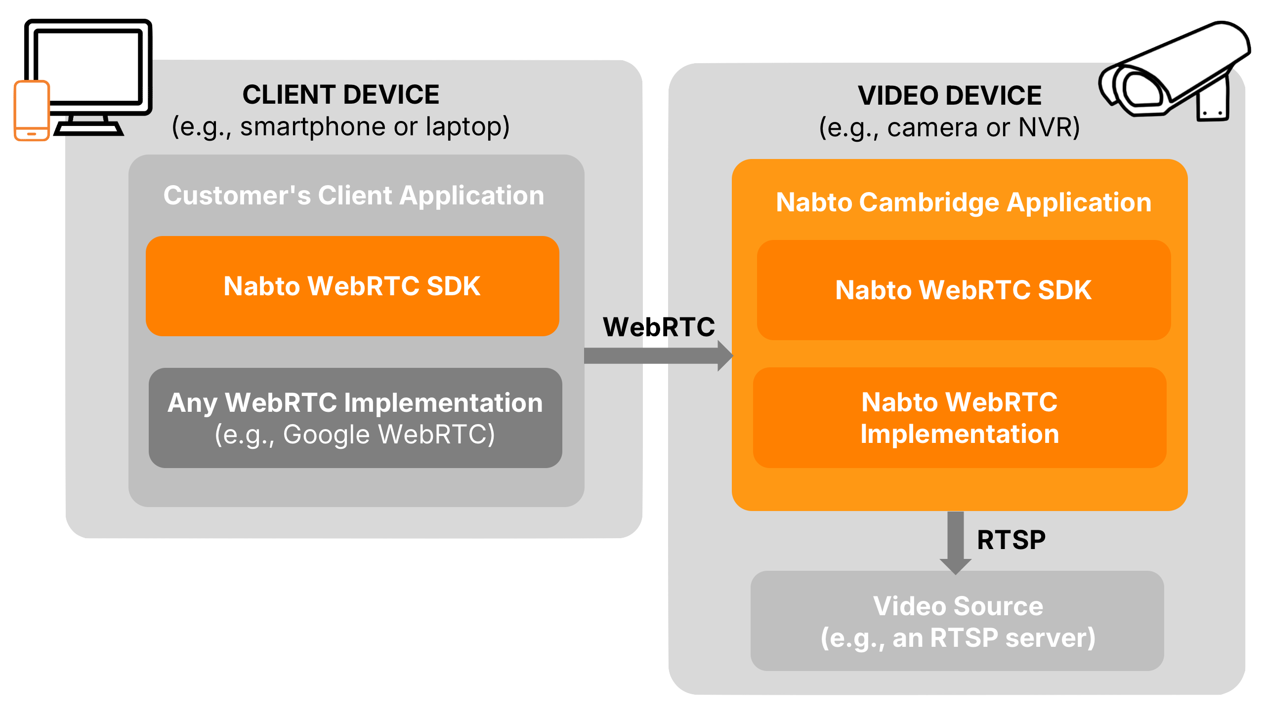 - No SDK integration. Cambridge handles all Nabto signaling and WebRTC negotiation in its own process.