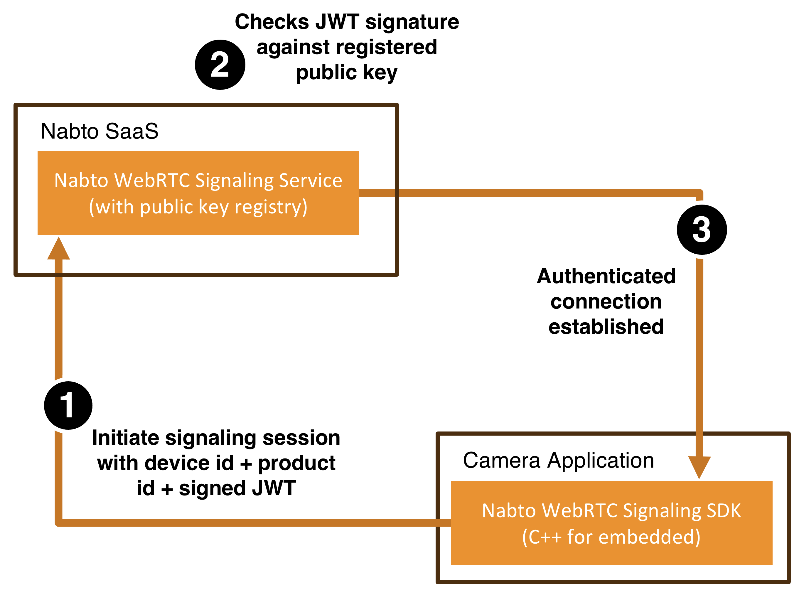 When a device (camera) connects to the signaling service, it initiates the handshake by including its identity (product ID + device ID). The signaling service then verifies the device’s authenticity using signed tokens: The device includes an authorization header containing a JWT that embeds its identity and is signed using its private key. The signaling service validates this token by checking the signature against the registered public key for the device.